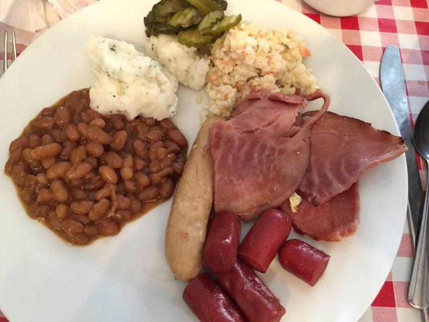 Mindennek közös nevezője a juharszirup. Szinte mindenben van valamennyi szirup. A sonka a juharszirup gőzében érlelődik és fő, a szalonnás babban is van juharszirup, a virsli is abban van megforgatva. A nagyon finom sárgaborsó levesben is épp csak annyi van a juharszirupból, hogy kellemesen édeskés legyen, de ne cukros. A főételekből amiben nincs juharszirup, abban majd lesz – az asztalszomszédaink québeciek voltak mindkét alkalommal, és alaposan meglocsolták az ételt még egy kis plusz sziruppal, a biztonság kedvéért. A desszertek pedig tocsognak a cukortól. Az olyanoknak, mint én, aki nem bírják és nem is szeretik a cukros ételeket, ez garantált migrénnel jár, de egyszer évente belefér. Amúgy mindezek a fogások meglepően finomak.