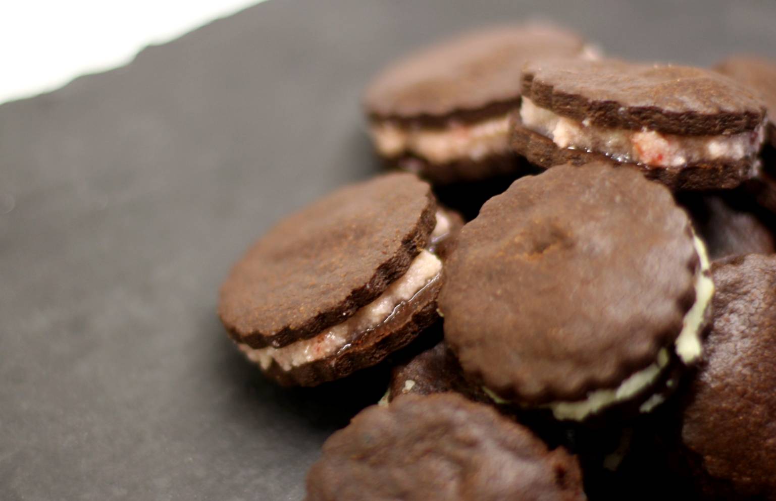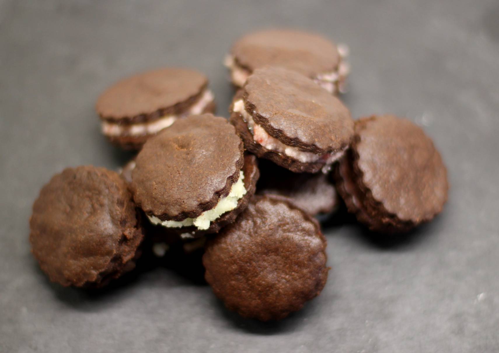 Miközben sülnek és hűlnek a kekszek, elkészítem a krémeket, amikkel szeretném őket összeragasztani. Egy jó evőkanálnyi krémet kanalazok vagy nyomok habzsák segítségével egy kekszere, majd egy másikat ráfektetek és óvatosan összenyomom őket. Hideg, de nem szilárdra fagyott krémmel a legegyszerűbb dolgozni.