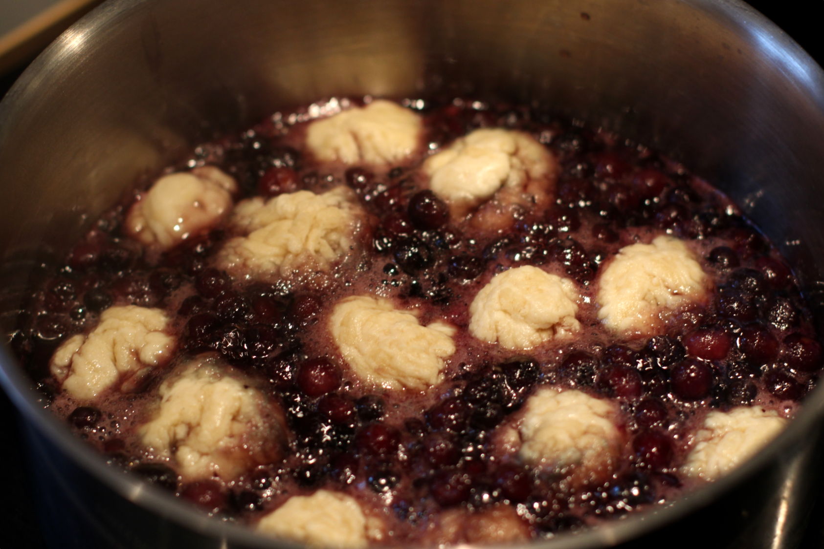 Nedves kézzel kisebb gombócokat formálok a tésztából, és a lassan fővő sziruphoz adom. Hét perc után megfordítom a gombócakt, és készre főzöm őket.
