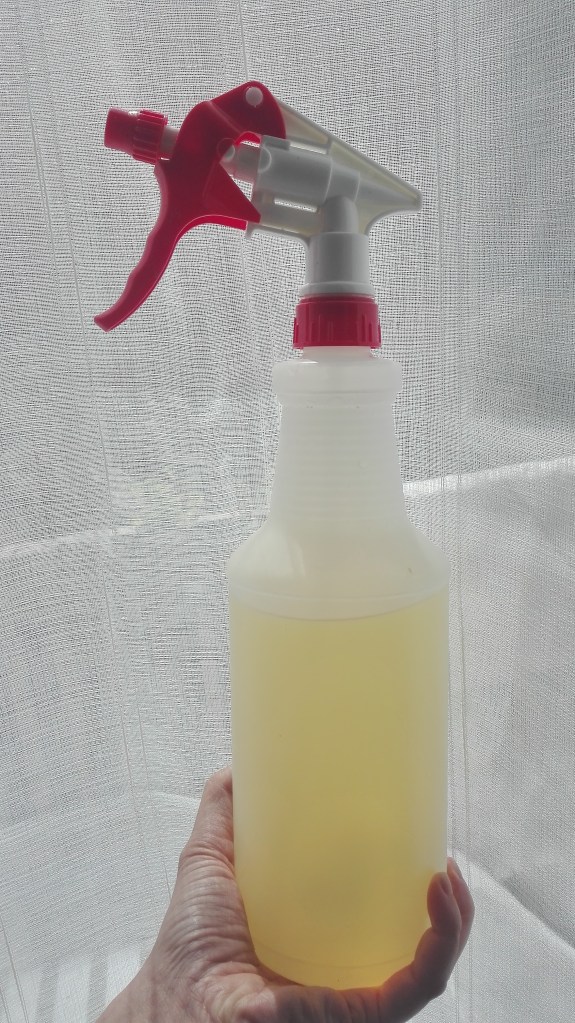 Egy hét múlva a citromos ecetet beleöntöm egy spricnis flakonba. Én egy olyan flakont használok, amit még az előző albérlő hagyott itt valamiért, de egy kiüresedett tisztítószeres flakon is jó. Kicsit felhígítom vízzel.