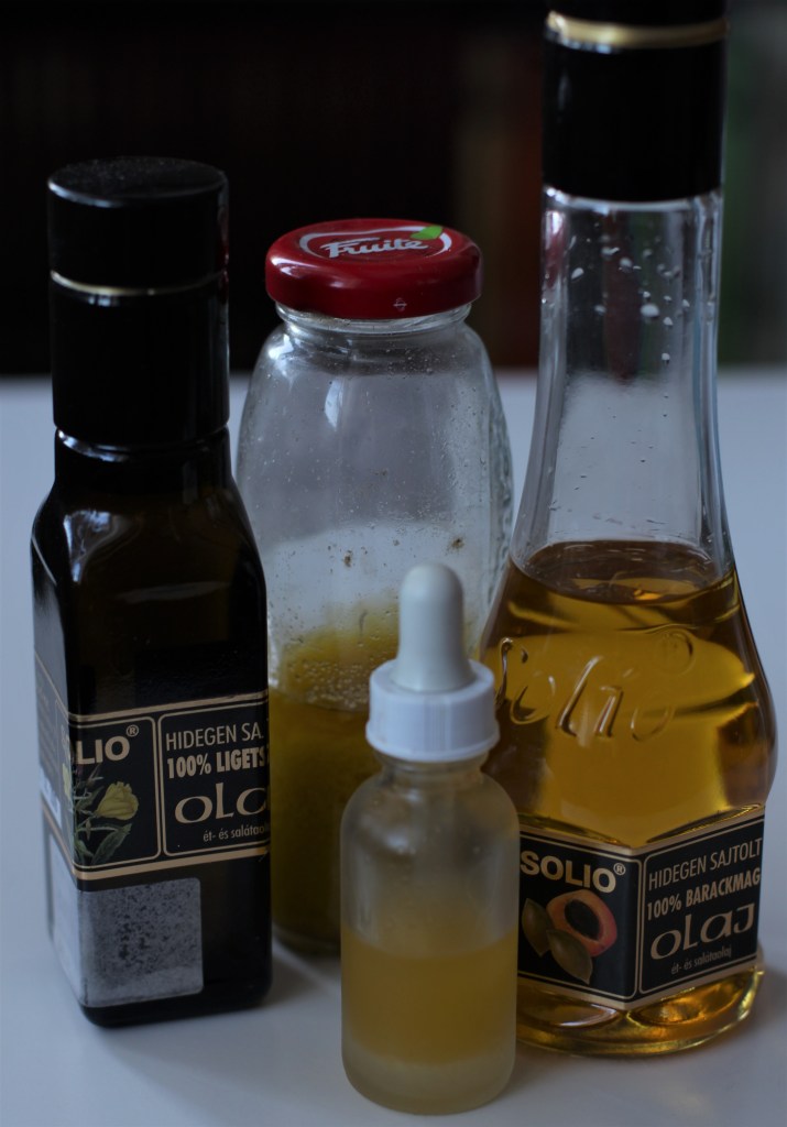 Van egy régi The Ordinary pipettás üvegem, ezt félig felöntöm ezzel az olajjal. Adok hozzá sárgabarackmag olajat. Eddig ez egy olyan szérum, amit nyáron a nap végén használok, napozás után, vagy a gyerekekre kenem strand után. Kiváló napégésre is (de ez velünk nem igen történik meg, mániásan védem a bőrünket a naptól). A sárgabarackmagolaj csodás antioxidáns. Salátára is csodás, de én főleg a bőrünkre használom, annyira kellemes.