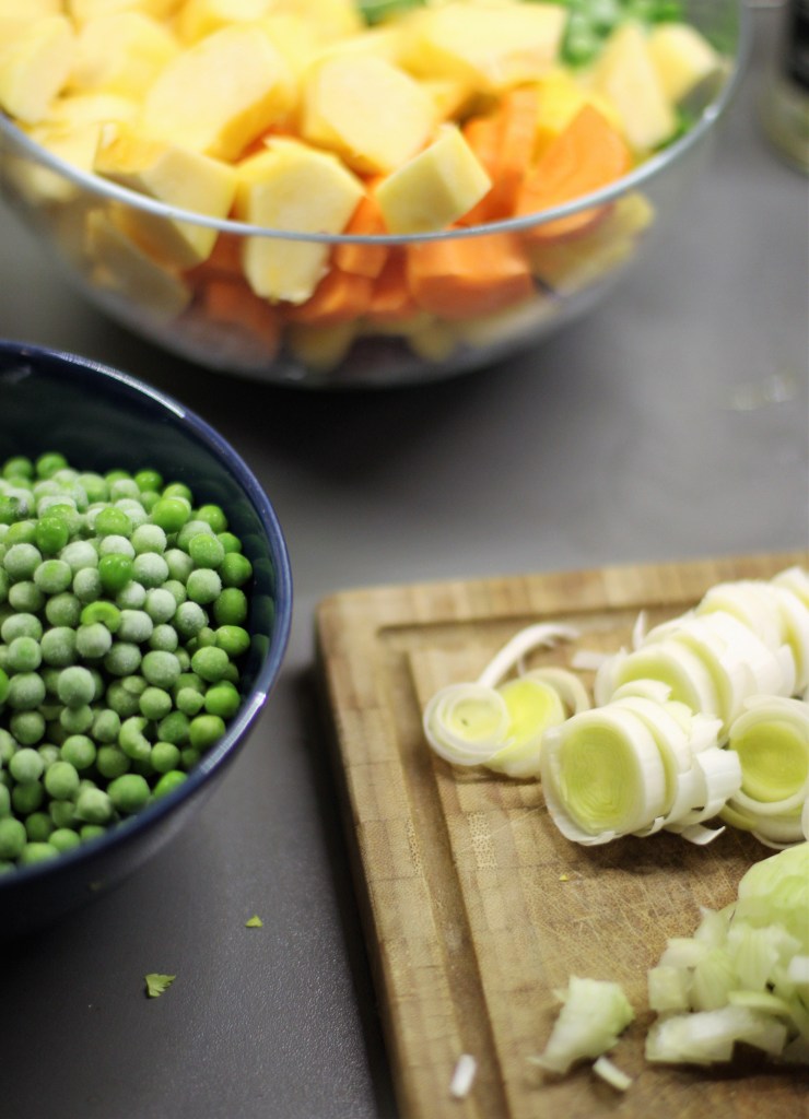 - Az összes heti főzéshez szükséges zöldséget megpucoltam és felszeleteltem. A pitéhez két kupac készült, a töltelékhez és a püréhez. Kivettem a fagyasztóból a borsót, felkockáztam a tököt, a felét hozzáadtam a borsóhoz. Került még bele karikázott répa és brokkoli is, és egy fél karikázott póréhagyma.