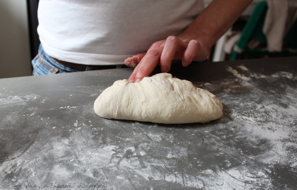 Körülbelül egy óra múlva, de legalább fél óra várakozás után jöhet a tészta. Nagyon enyhén lisztezett lapra teszem, és négy felé vágom a hablapátommal. Kisebb, hosszúkás hurkákra formázom ezeket, és letakarva hagyom pihenni őket 30 percet.