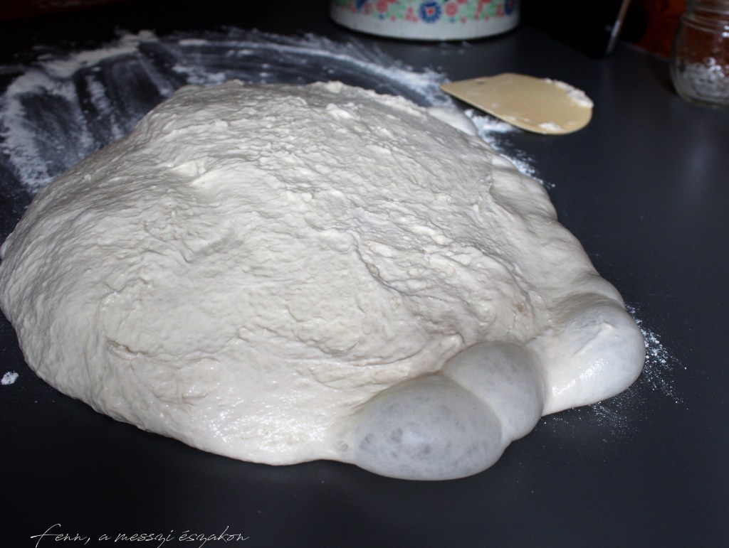 Mikor úgy érzem ez rendben van, fél óránként legalább négyszer egy “hajtogatom” a tésztát. Én ehhez a kedvenc habkártyámat használom, de lehet kézzel is csinálni. (Erről például Limaránál van egy jó képsor, a legegyszerűbb, ha ezt megnézitek, jól szemlélteti a mozdulatokat.)