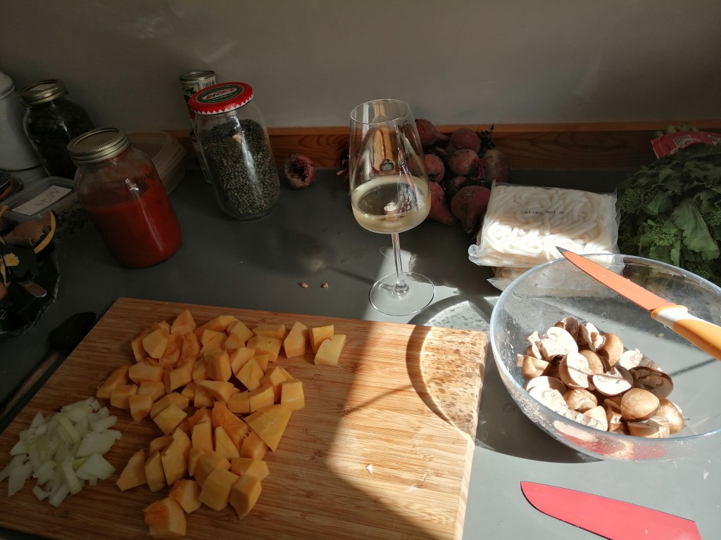 - Közben megpucoltam és felvágtam a gratin-hez a zöldségeket: gombát, tököt, és odatettem főni a puy-i lencsét. Szeretem ezt a fajta lencsét, mert könnyen fő, nem kell beáztatni (be lehet, de áztatás nélkül is relatíve hamar megfő). Hagymát szeleteltem, olajon üvegesre pirítottam, és ezen puhítottam meg fedő alatt a gombát a tökkel, fűszerekkel.