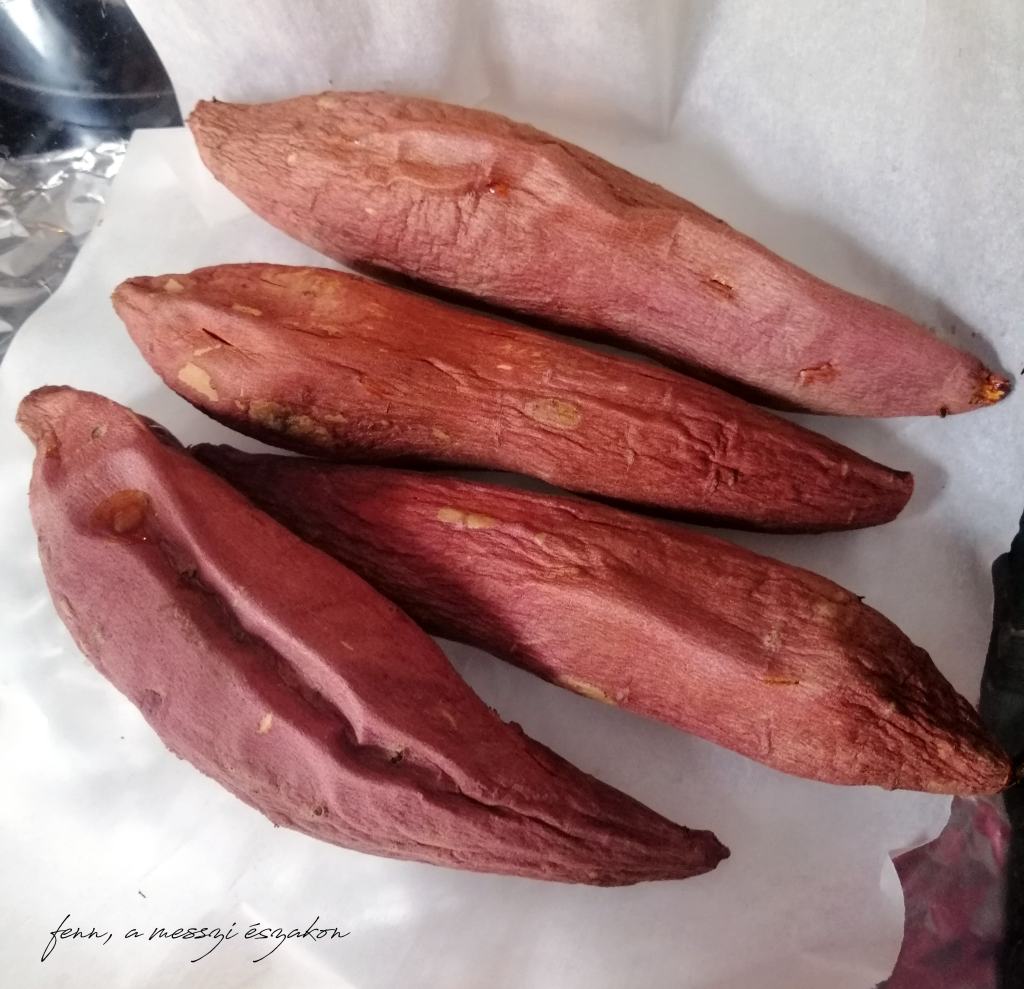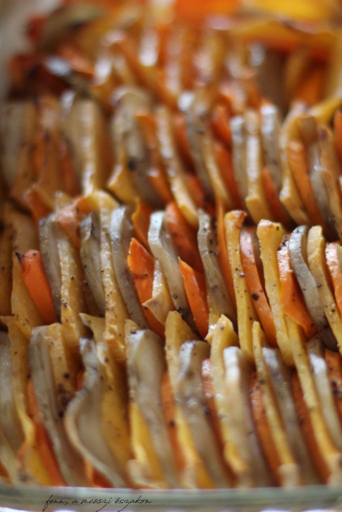 - A sütőt előmelegítettem 200 fokra. Lesikáltam négy nagyobb édeskrumplit, megszurkáltam őket és betettem sülni 20 perce, kb. Miközben sültek, megpucoltam az összes tianhoz előkészített zöldséget – egy maradék fél karórépát, két krumplit, két édesburgonyát, két közepes répát. Vékonyra szeleteltem őket, szépen felsorakoztattam őket egy tűzálló tálban. Meglocsoltam olívaolajjal, megszórtam sóval és borssal. Letakartam, és úgy ment a sütőbe az első 20 perce, majd fedő nélkül készre sütöttem. >> Hétfőn ez volt az ebédünk.