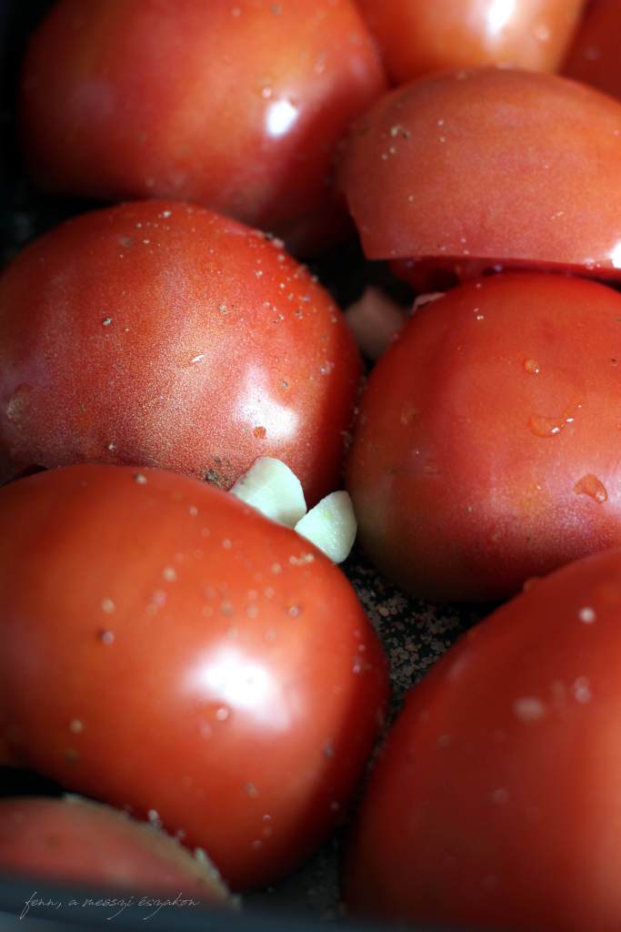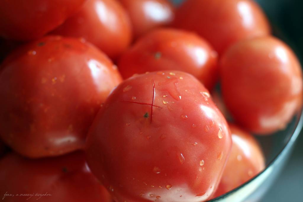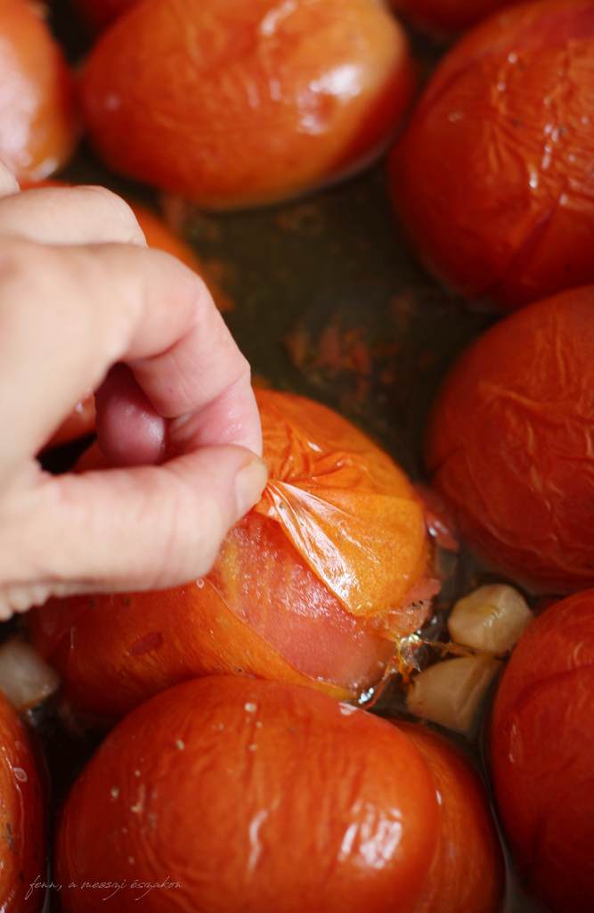 Felforralom a kisebb lábosban a vizet. Míg ez melegszik, bevágom a paradicsomok fenekét x alakban. Így dobálom őket 1-2 percre a forrásban lévő vízbe, aztán a szűrőkanállal kiemelem őket a vízből. Lehet őket gyorsan hideg vízbe is mártani, sőt, érdemes, aztán szépen csak lehúzom a bőrüket. Nem bonyolult és nem nehéz.