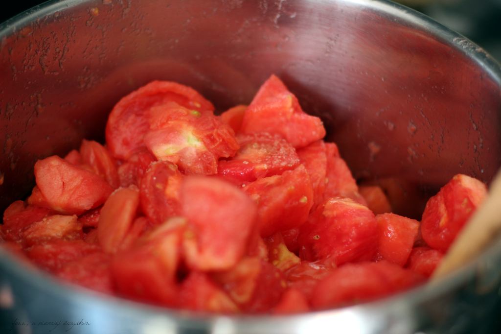 Alapesetben (azaz Magyarországon) a kertemből leszedett jószágokat főzném be, kiegészítve némi parasztparadicsommal. De itt az nincs, így marad, amit ad a piac. Szeretem, ha több fajta gyümölcs kerül a szószba, attól lesz igazán jó az íze, de ha más nincs, akkor legyen a hosszúkás, római típus, az mindig jó. Természetesen legyen érett, de nem túlérett.