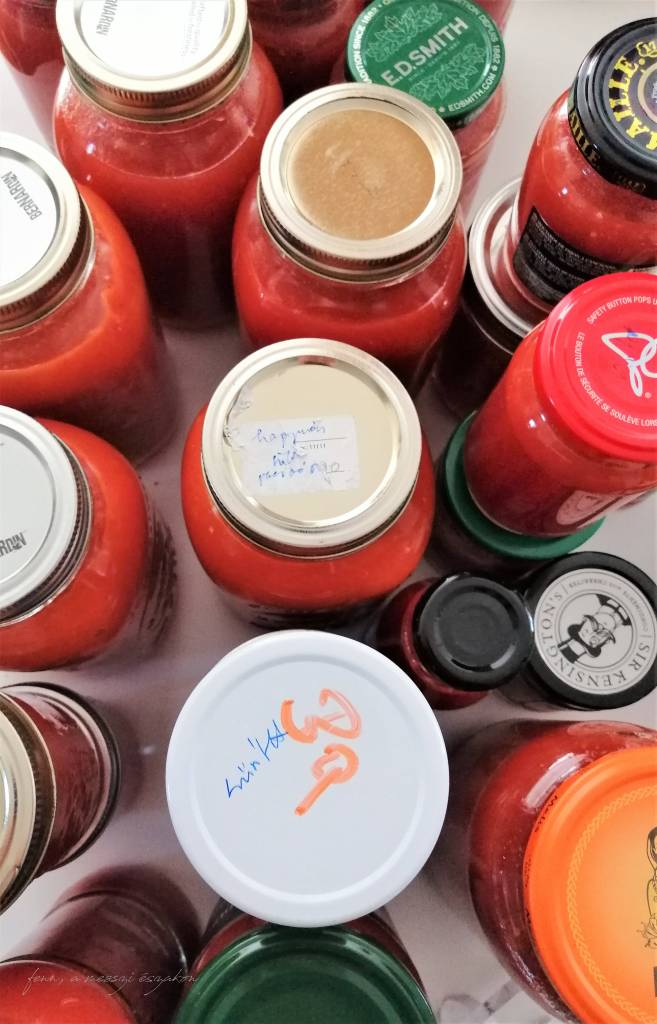 Én a szélesebb szájú, közepes üvegeket szeretem, illetve a klasszikus olasz paradicsomszószos üvegeket. Ezeket sütőben fertőtlenítem vagy a mosogatógép meleg programjával. Régebben főzögettem az üvegeket forró vízben, de az macerás, pláne egy kis konyhában, lesz így is elég nagy felfordulás.