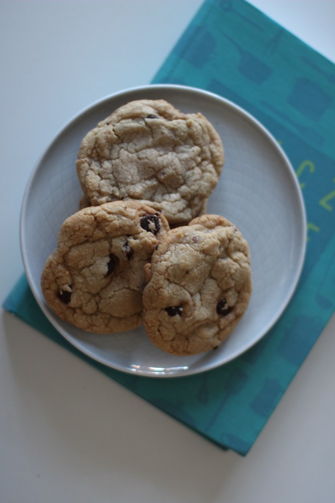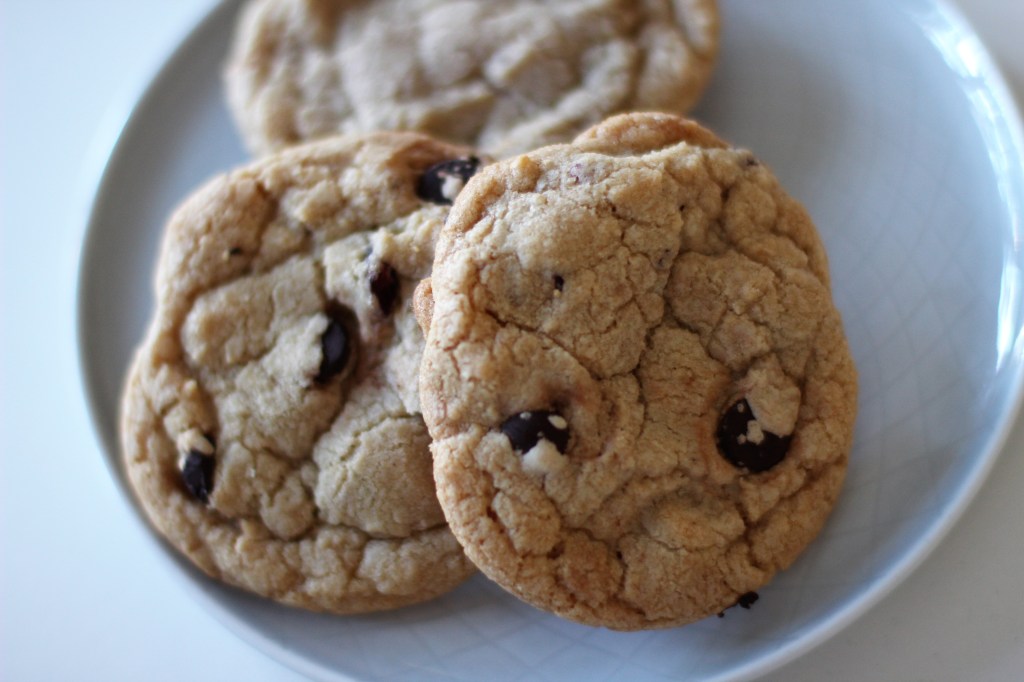 Ellenben ez a “rágós” (chewy) fajta kicsit összetettebb. A finomliszt mellé kerül egy kis kenyér liszt is és némi keményítő. Ezektől a tészta kicsit sűrűbb lesz. A vajat meg kell hozzá olvasztani. Továbbra is több benne a barna cukor, viszont kevesebb benne a szódabikarbóna. A tojások közül egy egész tojást adok csak hozzá, a másiknak csak a sárgáját teszem bele. Hát így lesz más az állaga. (Egy korábbi cikkben, ahol szintén cookie-k készültek, szintén vannak tippek arra, hogyan lehet a kívánt állagot elérni a hasonló kekszeknél – itt én nem használtam semmilyen szirupot a sütikbe, de az is lehet megoldás.)