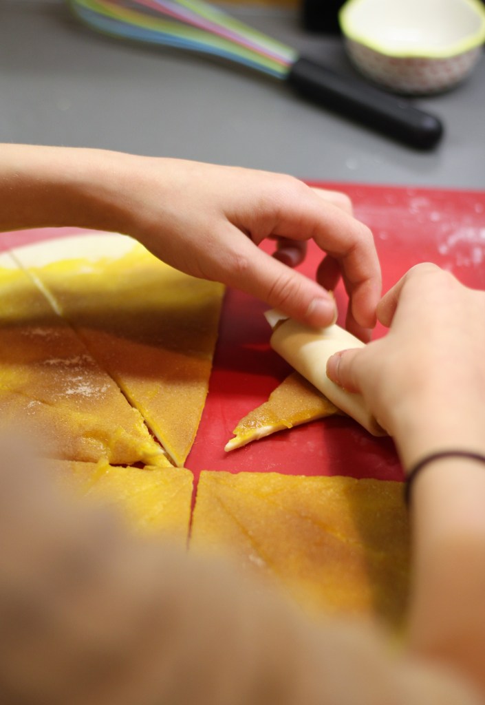 - Egy enyhén lisztes nyújtódeszkán kinyújtom az egyik adag tésztát a lehető leginkább kör alakúra és kellően vékonyra, nekem kb 30-35 centisek lettek. A tökös krém harmadával megkenem, majd megszórom a fahéjas cukor harmadával. Pizzavágóval 12 cikkelyre vágom, és kis kiflikké tekerem fel őket, és megkenem mindegyiket a tejjel elkevert tojással. Mehetnek a sütőbe egy kibélelt tepsin, sütőtől függően 18-20 perc alatt aranybarnára sütöm őket.