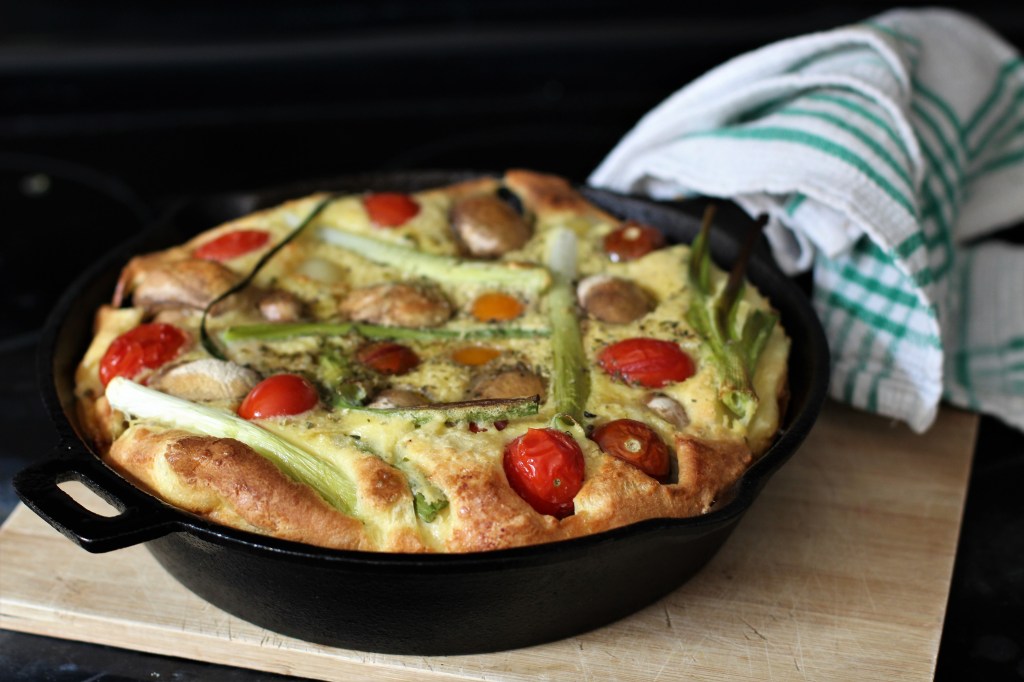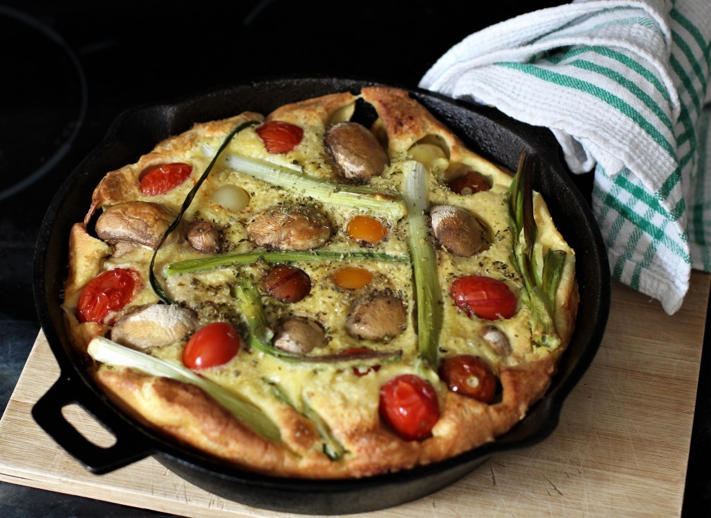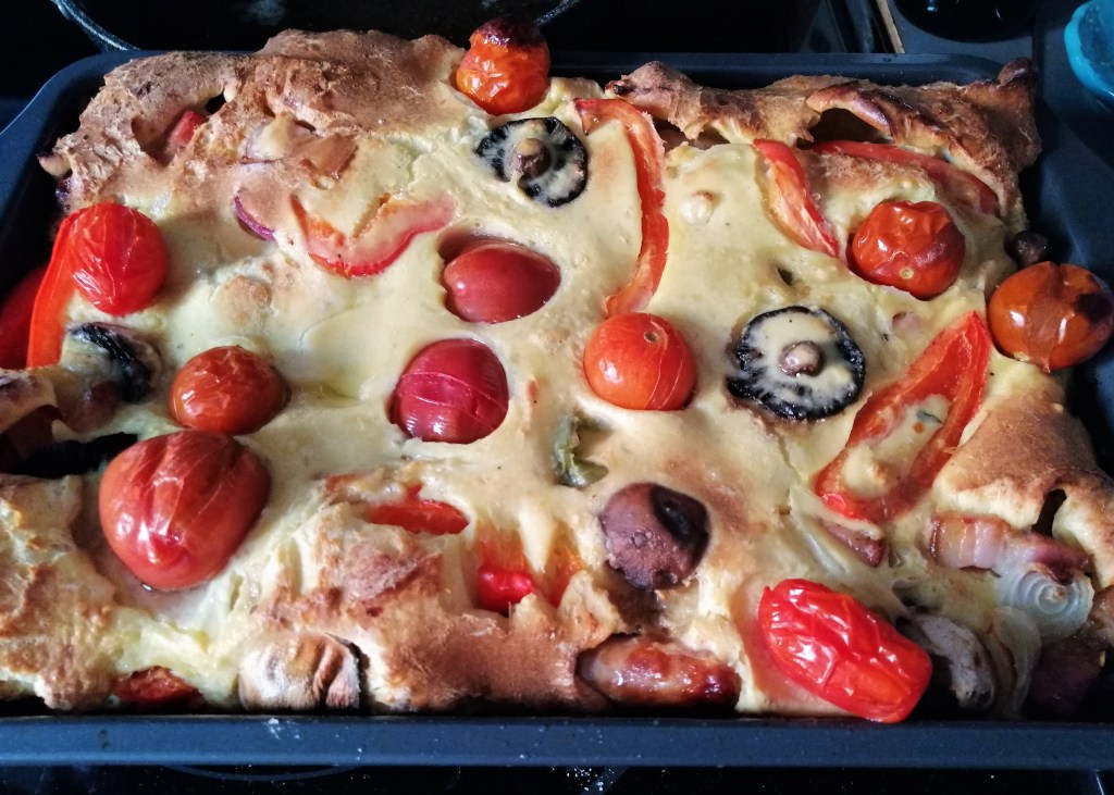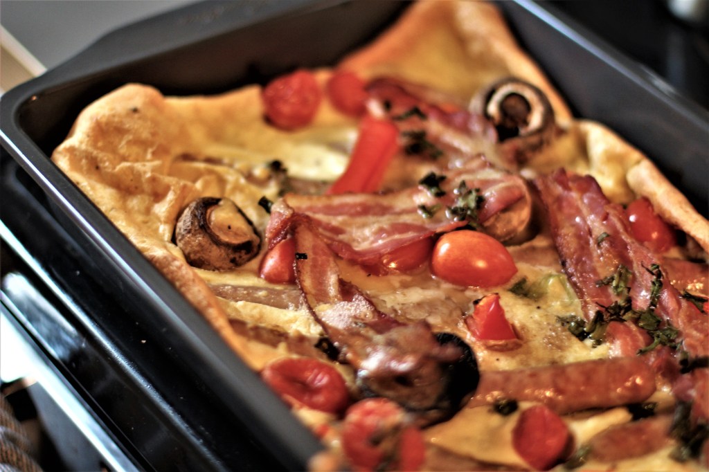 Megígértem, itt van. Az egyben sütött Yorkshire pudding vacsorára. Valójában azonban az angol reggeli hozzávalóival sül. És kiváló ebédre is. Vagy akár egy brunch alkalmával.