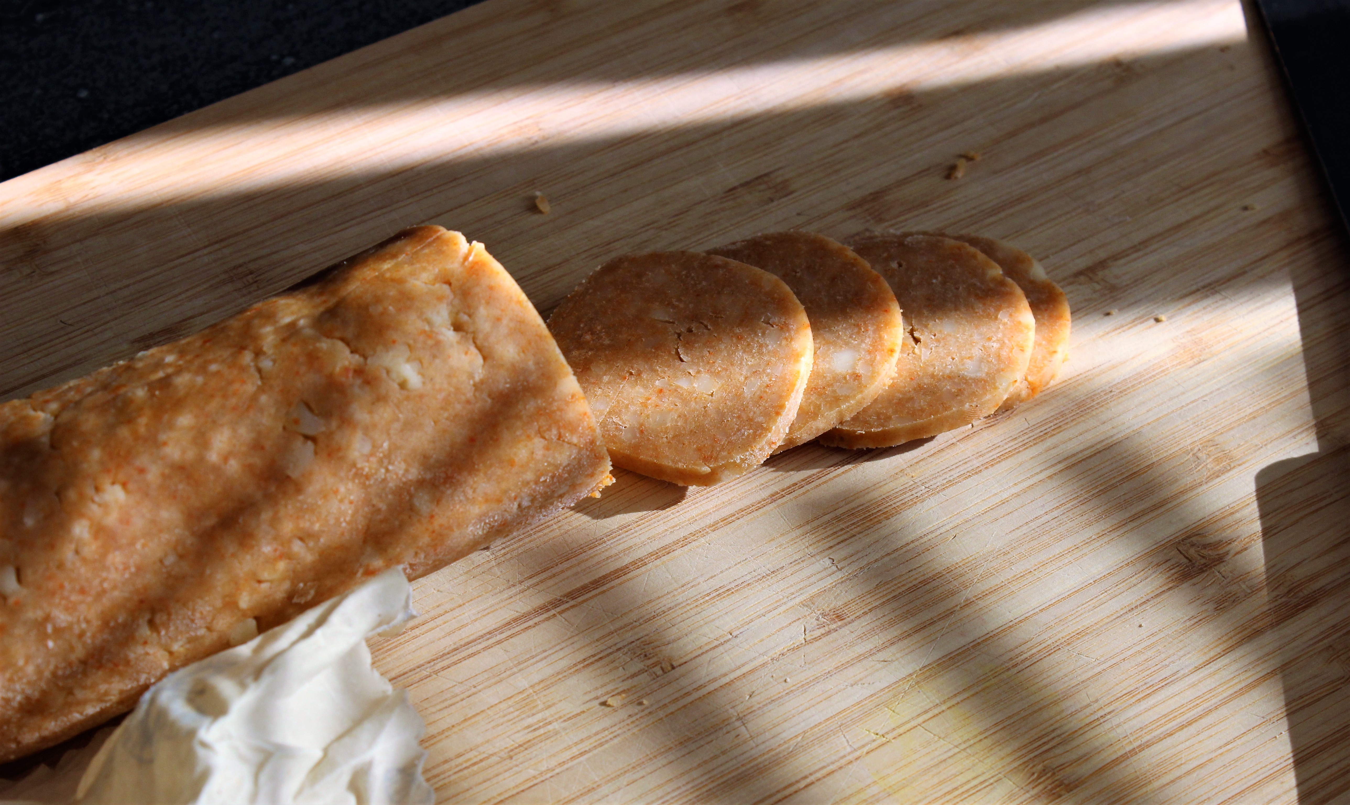 - Előmelegítem a sütőt 180 fokra. Egy deszkán a hurkát 2-3 milliméteres szeletekre vágom egy éles késsel. Gyorsan dolgozom, hogy ne olvadjon meg a zsiradék. Sütőpapírral vagy szilikonlappal kibélelt sütőlapon a kekszeket, megszórom őket tetszőlegesen, és 10-15 perc alatt készre sütöm.